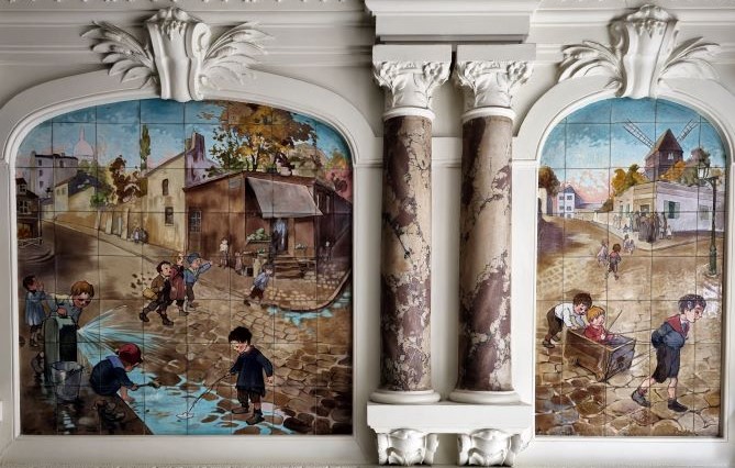 centre une fresque de Poulbot reproduite sur céramique dans l’entrée d’un