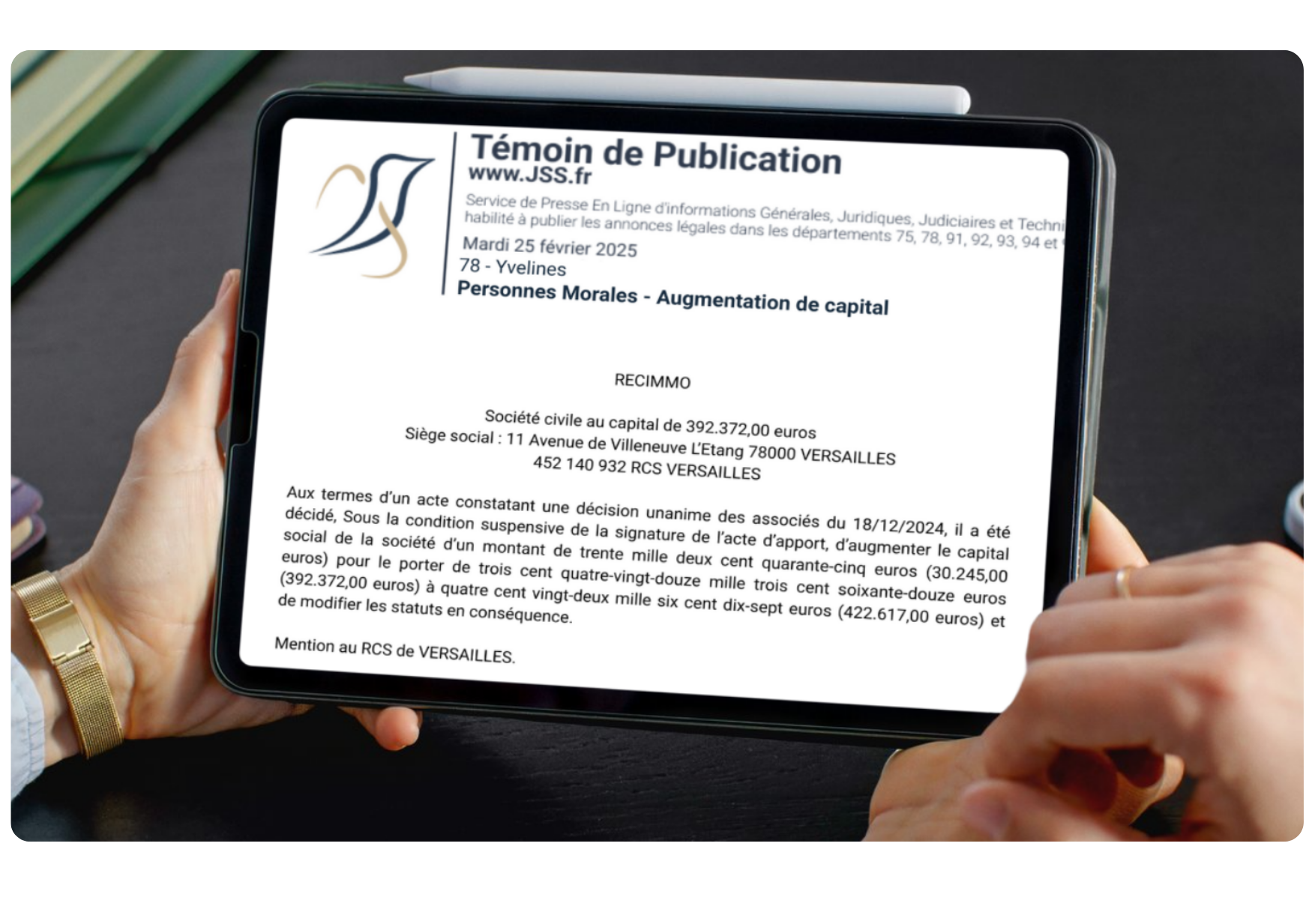 Avec le JSS, publiez en toute simplicité votre annonce légale d’augmentation de capital directement en ligne via notre SPEL, habilité sur les départements 75, 78, 91, 92, 93, 94 et 95.