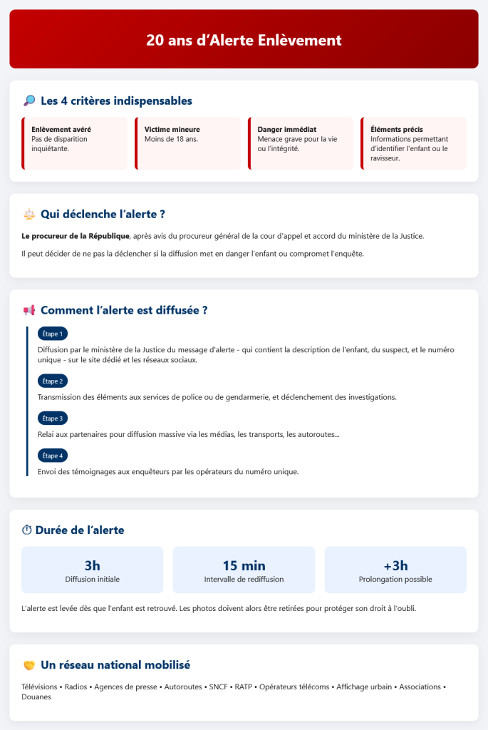 Deux décennies après sa création, le dispositif national affiche un bilan largement positif : 38 enfants ont été retrouvés sains et saufs, indique le ministère de la Justice. Deux fois cependant, le drame n’a pas pu être évité : Vanille, 1 an, et Celya, 6 ans, ont été retrouvées décédées, respectivement en 2020 et en 2024.