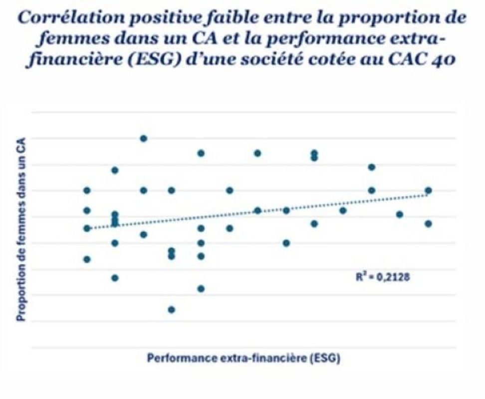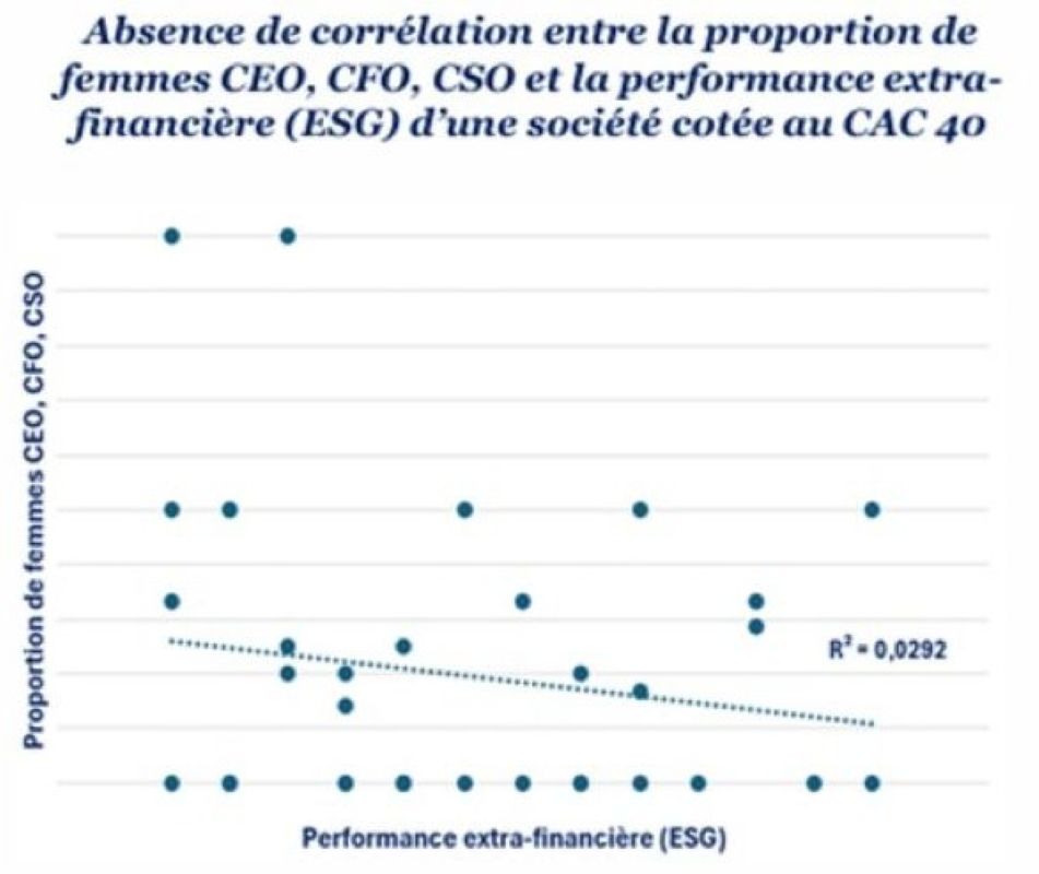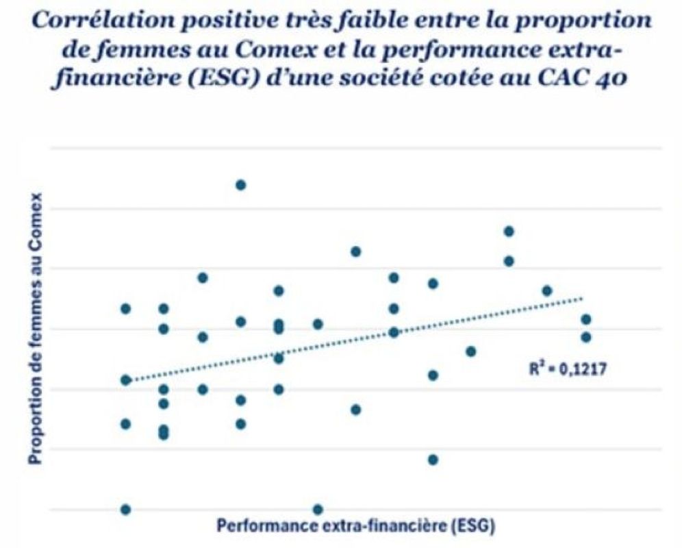 Le lien potentiel entre diversité de genre et performance ESG fait l’objet de débats nourris dans la littérature académique. Dans une analyse publiée en 2025 qui travaille beaucoup sur ces thèmes, Michel Ferrary avance que la présence des femmes dans les postes de direction exerce une influence positive sur les résultats ESG des entreprises. Toutefois, aucun des coefficients de corrélation observés ne dépasse le seuil de 0,80 généralement retenu en économétrie pour établir une relation explicative robuste entre variables.