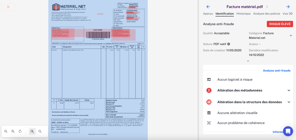 P.-A. G. : On utilise un logiciel qui se base sur différents points de contrôle et qui s’appuie sur deux piliers. Premièrement, l’analyse informatique du document : ses métadonnées, son visuel au pixel près, ce qui va permettre de dire s’il a été retouché sans aller dans le contenu. C’était très nouveau quand on a sorti notre solution, en 2023, après quatre ans de R&D – qui est toujours à ce jour notre plus gros budget.