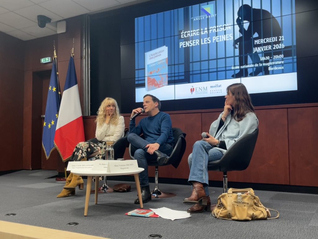 C’est donc en pleine résonance avec l’actualité que la conférence Angle Droit, organisée par l’École Nationale de la Magistrature le 21 janvier dernier, incitait à réfléchir sur le sens de la peine, réduite parfois à deux conceptions antagonistes : celle d’une prison punitive pour protéger la société, et celle d’une sanction favorisant la réinsertion des personnes détenues, afin de prévenir la récidive. Une ambivalence lisible dès l’article 130-1 du Code pénal, qui définit la peine comme « une sanction de l’auteur de l’infraction » ; elle doit également permettre de « favoriser son amendement, son insertion ou sa réinsertion ». Invités au sein de l’amphithéâtre Simone-Veil, Didier Castino, enseignant de lettres en prison et auteur du roman L’application des peines et Cécile Delazzari, juge de l’application des peines à Toulouse, ont partagé leurs expériences le temps d’un débat animé avec le public.