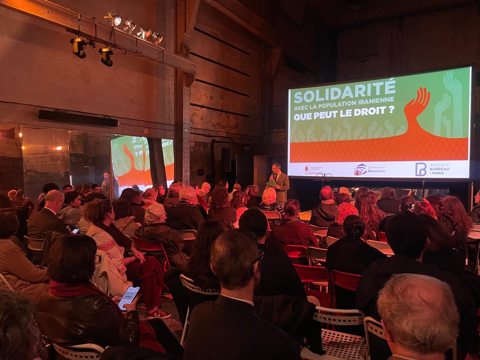 Dans cette ancienne sous-station électrique du XIe arrondissement de Paris, transformée en étonnant tiers-lieu culturel, une centaine de personnes se sont réunies à l’appel conjoint du Conseil national des barreaux (CNB), du barreau de Paris et de la Conférence des bâtonniers, pour réaffirmer l’engagement de la profession d’avocat aux côtés du peuple iranien et pour « interroger, collectivement, ce que dit et peut le droit face aux exactions, à l’arbitraire et à la violence d’État ».