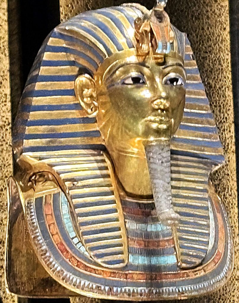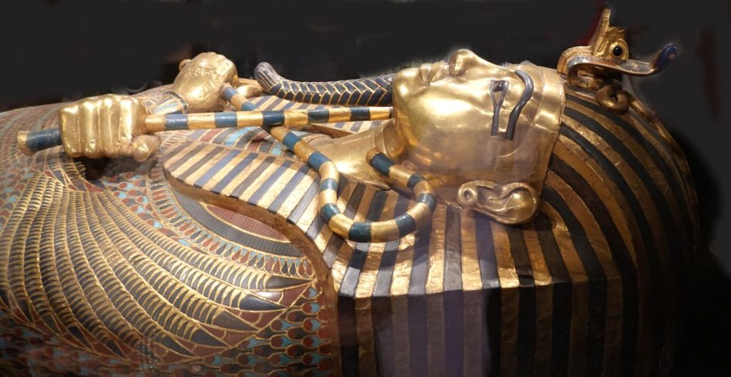 Son sarcophage, ses catafalques, son masque d’or triomphent dans des vitrines autour desquelles se pressent des milliers de visiteurs assoiffés de photos et de partage d’un imaginaire mondial.