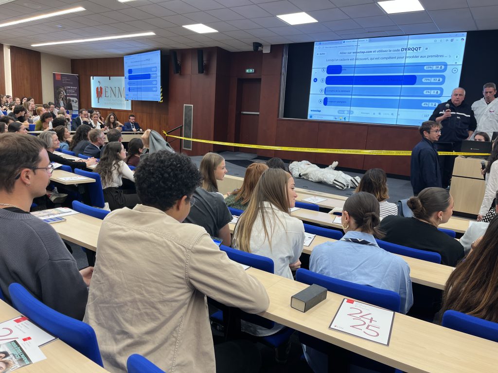 Car c’est sur scénario croustillant que repose, en ce 2 octobre, l’édition 2025 de la Nuit du Droit interprétée par l’ENM. Devant le corps entouré d’un scotch jaune d’avertissement, une centaine de collégiens et de lycéens d’Aquitaine, beaucoup d’étudiants en droit et quelques aficionados d’intrigues policières assistent à un épisode de « Faites entrer la victime » qui tend à mettre en lumière le déroulement d’une enquête et l’importance de la preuve en matière pénale.
