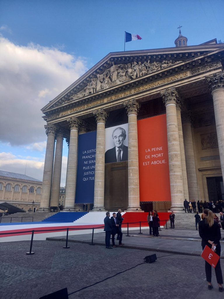 Le ciel est clair, et les rues du Ve arrondissement plutôt calmes malgré la foule, fermement encadrée par les – nombreuses – forces de l’ordre. Le Panthéon semble attendre le public : paré des trois couleurs de la Nation, et du portrait en noir et blanc de Robert Badinter, il est éclairé de grands faisceaux lumineux. Une phrase orne sa façade : « La justice française ne sera plus une justice qui tue. La peine de mort est abolie. » Car c’est bien cette loi historique qui est au cœur des hommages, et cette lutte de Badinter pour la vie humaine va imprégner chacun des discours à suivre. Mais de Robert Badinter, il faut retenir les autres combats, tient à rappeler Eric Dupond-Moretti.
