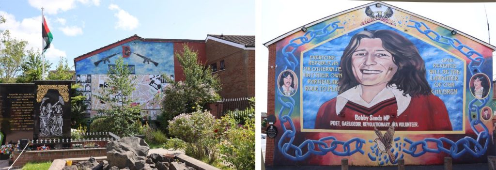 * Cette fresque, souvent montrée aux touristes lors d’un parcours mémoriel, montre un Bobby Sands souriant, en noir et blanc pour en faire une icône intemporelle presque sanctifiée. Le fond représente le crépuscule, les barbelés et un mirador de la célèbre prison de Maze où furent détenus les prisonniers de l’IRA. Les étoiles symbolisent la constellation de la Croix du Sud pour donner au sacrifice de Sands une portée universelle et cosmique. Les entrelacs celtiques encadrent l’image, reliant le martyr à la tradition gaélique. La harpe dorée, symbole de l’Irlande, est présente. La citation, en forme d’injonction, peut se traduire ainsi : « Après que nous serons partis, que direz-vous que vous faisiez ? Direz-vous que vous étiez avec nous dans notre lutte, ou bien que vous vous conformiez au système même qui nous a poussés à la mort ? ». Cette fresque fait du visage de Sands le centre d’un récit héroïque et identitaire. L’espace urbain devient un livre vivant.