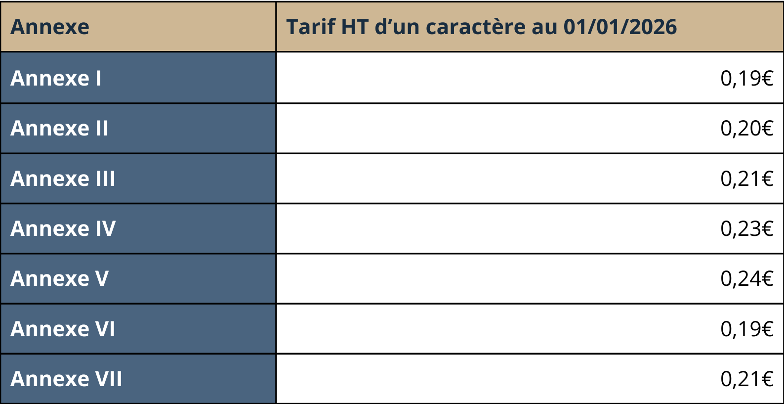 Les tarifs au caractère en 2026