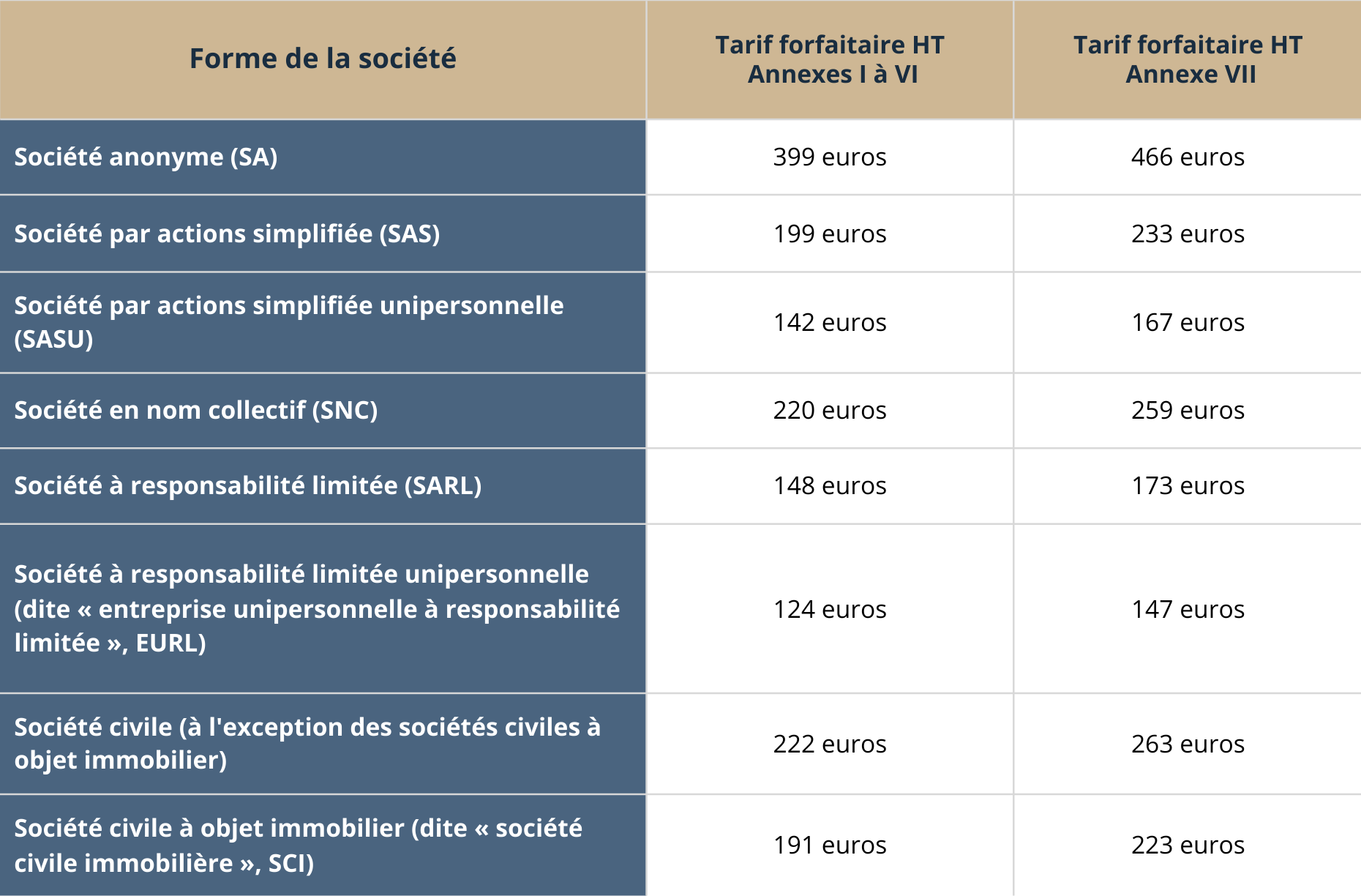 La constitution de certaines sociétés telles que les SARL / EURL ou SARLU / SAS / SASU / SC / SCI / SNC / SA bénéficie d’un tarif forfaitaire.