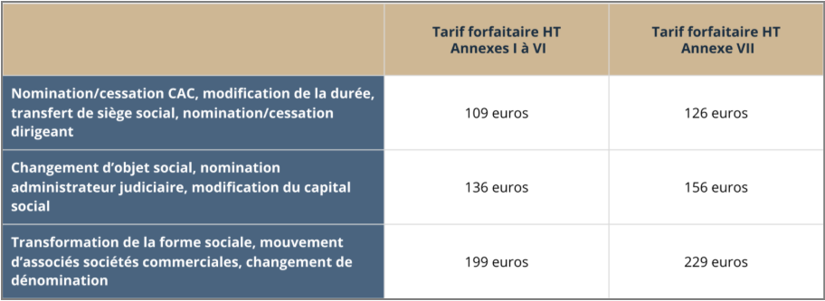 - modifications (une modification unique par annonce) telles que le transfert de siège social, la modification du capital, le changement de dénomination, etc.